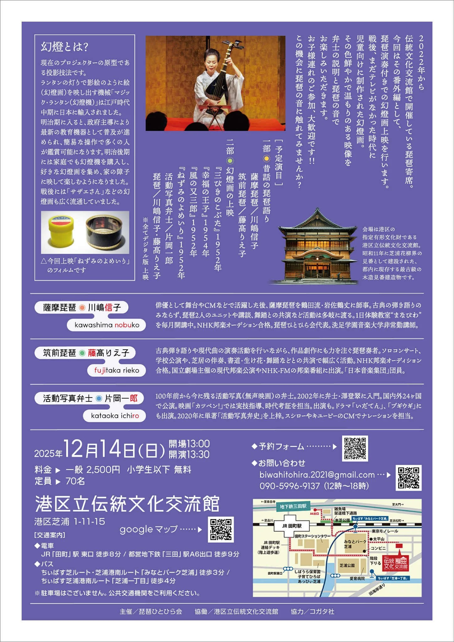 ♦出演:薩摩琵琶/川嶋信子、筑前琵琶/藤髙りえ子、活動写真弁士/片岡一郎