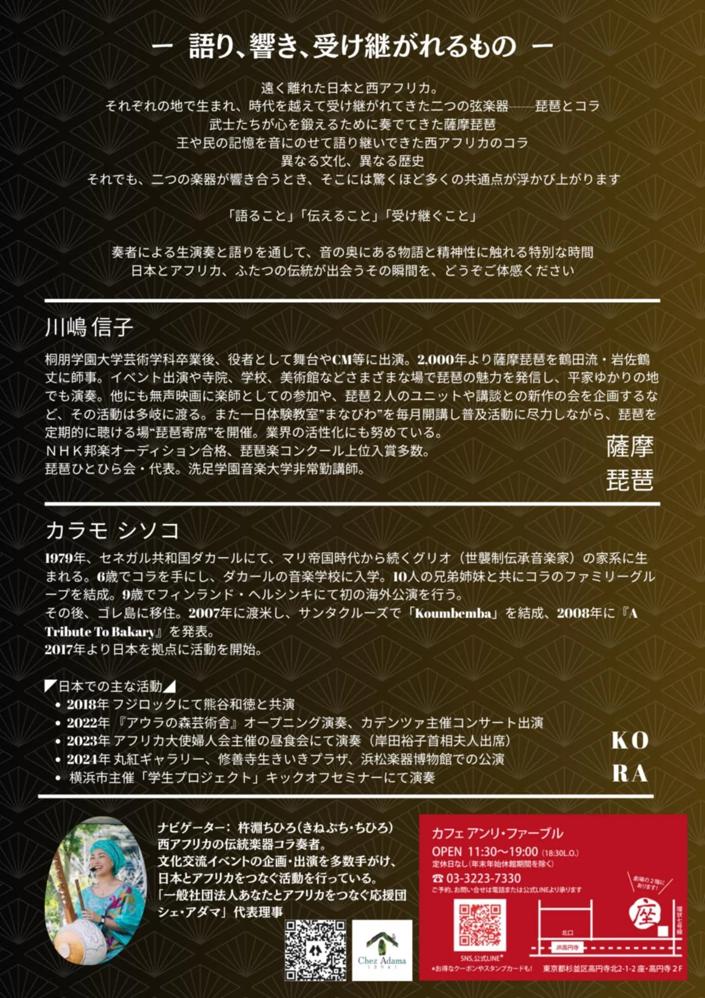 ◎出演 カラモ シソコ (コラ)、川嶋信子 (薩摩琵琶)
